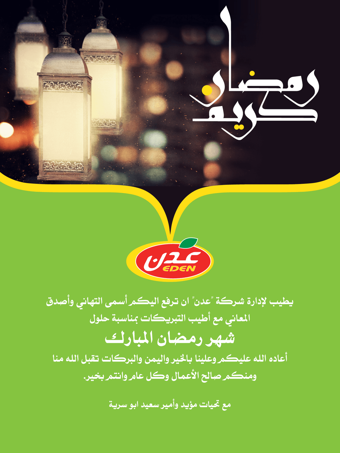 يطيب لإدارة شركة عدن أن ترفع اليكم أسمى التهاني وأطيب المباركات بمناسبة حلول شهر رمضان المبارك، أعاده الله عليكم وعلينا بالخير واليمن والبركات تقبل الله منا ومنكم صالح الأعمال وكل عام وانتم بخير .. مع تحيات مؤيد وأمير سعيد ابو سريه