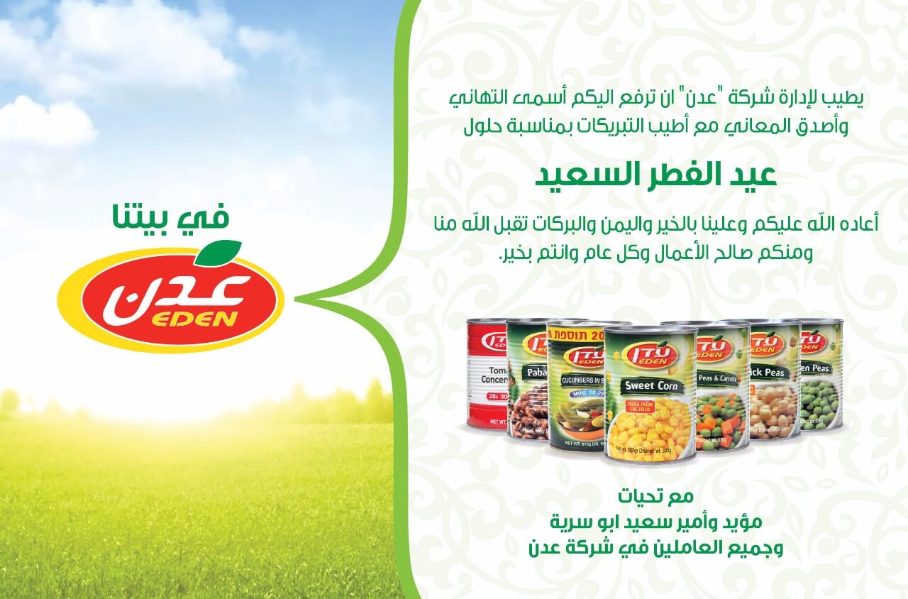 يطيب لإدارة شركة عدن أن ترفع اليكم أسمى التهاني وأطيب المباركات بمناسبة حلول عيد الفطر السعيد، أعاده الله عليكم وعلينا بالخير واليمن والبركات تقبل الله منا ومنكم صالح الأعمال وكل عام وانتم بخير .. مع تحيات مؤيد وأمير سعيد ابو سريه