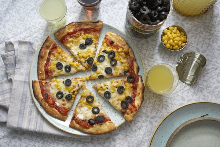 نسخن الفرن لدرجة حرارة عالية جدا، ثم نرُق العجين ليصبح بشكل دائري ثم نضع مقدار ملعقة ونصف من الصلصة ونقوم بفردها على العجينة، نبقي الأطراف بدون الصلصة، بعدها نرش الجبنة والذرة وقطع الزيتون، وندخلها للفرن بمعدل 10 دقائق (إذا لم نستعمل صينية خاصة للبيتزا، يستحسن استعمال ورق الزبدة حتى لا تلتصق العجينة)