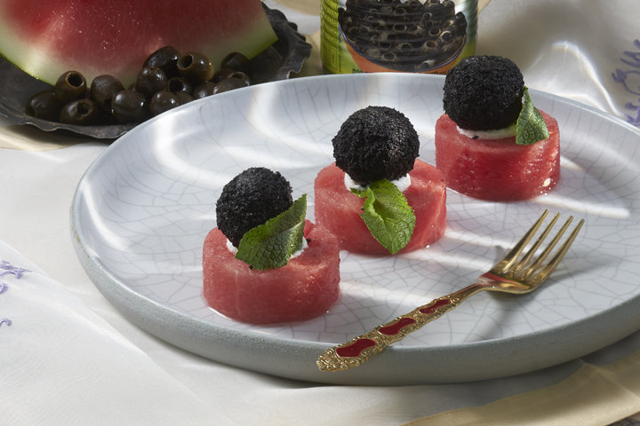 نضع قطع البطيخ بالصحن ونضع فوقها قليلا من اللبنة ثم نقوم بتغليف اللبنة المكبوسة ببودرة الزيتون ونضعها على قطعة البطيخ ونزيين بورق النعنع وتقدم